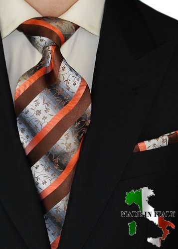 Berioni Hand Made in Italy 100% Woven Silk Mens Neck Tie + Pocket Square Jacquard Woven Tie and Hanky Set Black Orange A4 (Black Orange A4)